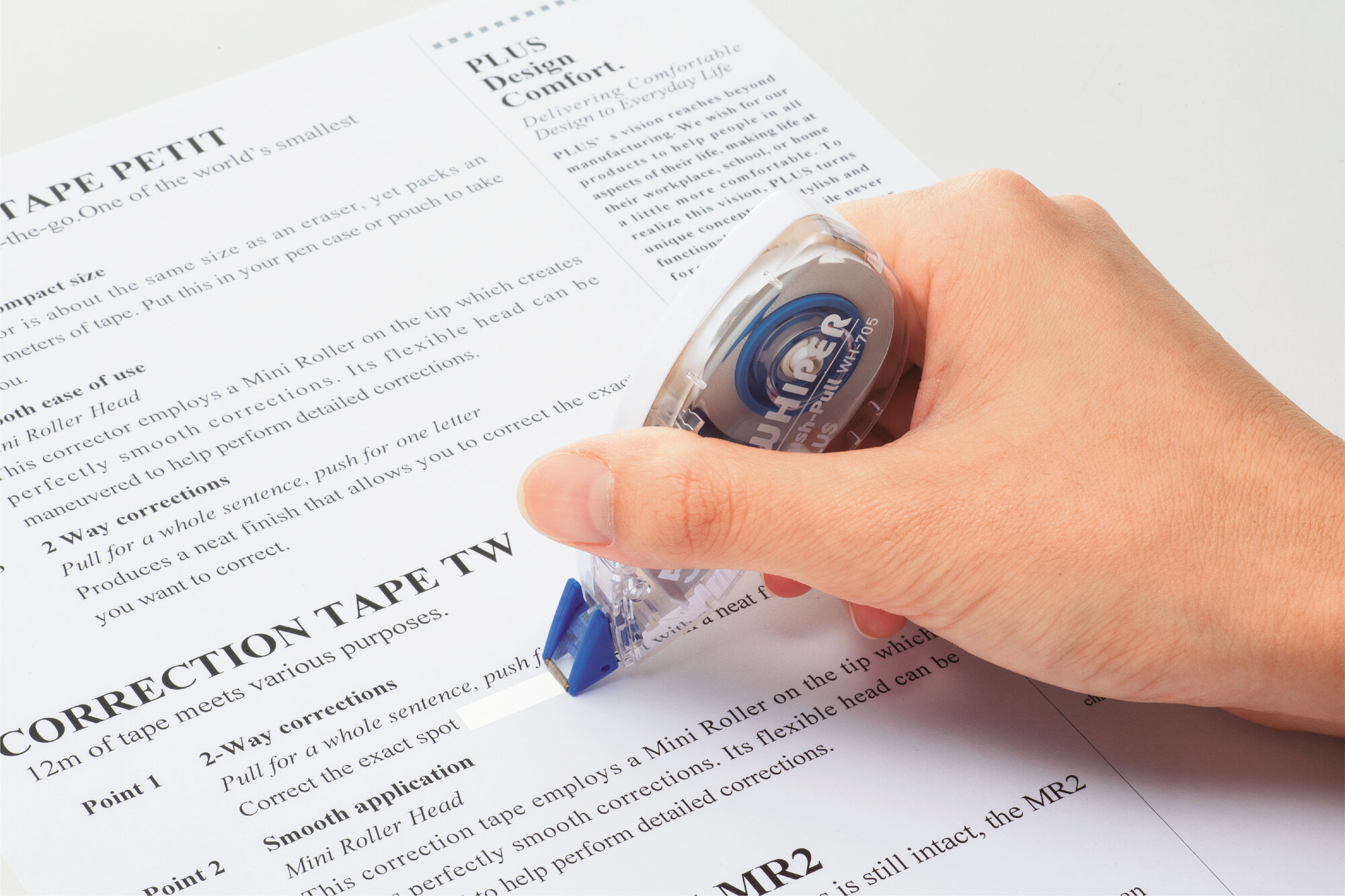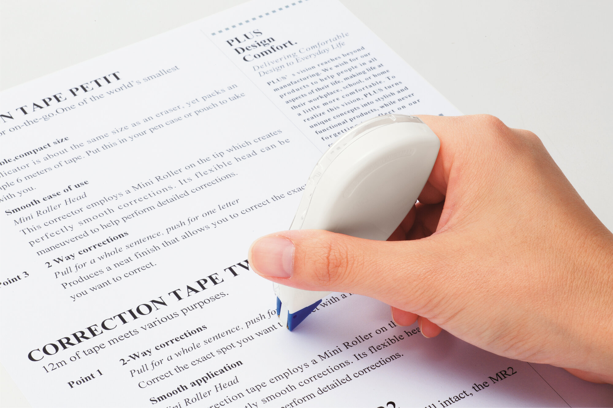 • Precyzyjna końcówka pozwala dokładnie nanosić taśmę nawet na drobny tekst.